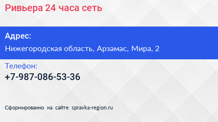 Ривьера 24 часа, сеть по адресу Нижегородская область, Арзамас, Мира, 2 в дальнейшем Организация, размещена в следующих категориях:
