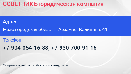 СОВЕТНИКЪ, юридическая компания по адресу Нижегородская область, Арзамас, Калинина, 41 в дальнейшем Организация, размещена в следующих категориях: