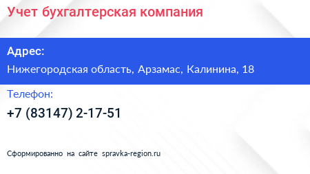 Учет, бухгалтерская компания по адресу Нижегородская область, Арзамас, Калинина, 18 в дальнейшем Организация, размещена в следующих категориях: