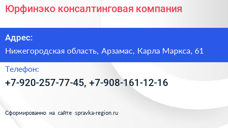 Юрфинэко, консалтинговая компания по адресу Нижегородская область, Арзамас, Карла Маркса, 61 в дальнейшем Организация, размещена в следующих категориях: