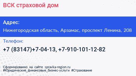 ВСК, страховой дом по адресу Нижегородская область, Арзамас, проспект Ленина, 208 в дальнейшем Организация, размещена в следующих категориях: