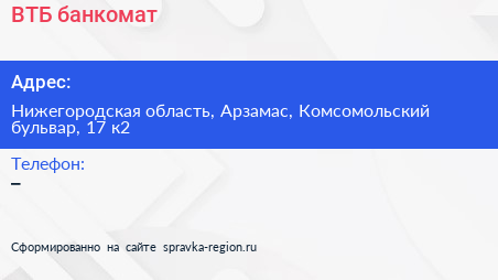 ВТБ, банкомат по адресу Нижегородская область, Арзамас, Комсомольский бульвар, 17 к2 в дальнейшем Организация, размещена в следующих категориях: