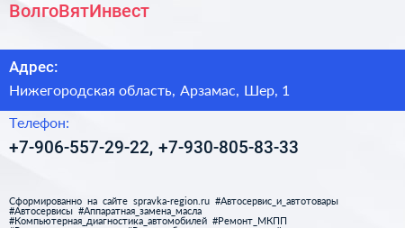ВолгоВятИнвест по адресу Нижегородская область, Арзамас, Шер, 1 в дальнейшем Организация, размещена в следующих категориях: