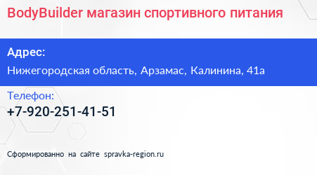 BodyBuilder, магазин спортивного питания по адресу Нижегородская область, Арзамас, Калинина, 41а в дальнейшем Организация, размещена в следующих категориях: