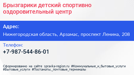 Брызгарики, детский спортивно-оздоровительный центр по адресу Нижегородская область, Арзамас, проспект Ленина, 208 в дальнейшем Организация, размещена в следующих категориях: