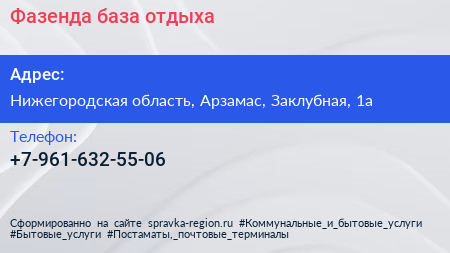 Фазенда, база отдыха по адресу Нижегородская область, Арзамас, Заклубная, 1а в дальнейшем Организация, размещена в следующих категориях: