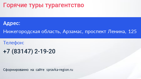 Горячие туры, турагентство по адресу Нижегородская область, Арзамас, проспект Ленина, 125 в дальнейшем Организация, размещена в следующих категориях:
