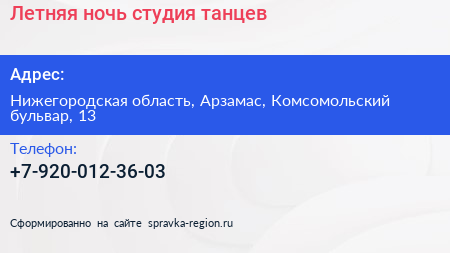 Летняя ночь, студия танцев по адресу Нижегородская область, Арзамас, Комсомольский бульвар, 13 в дальнейшем Организация, размещена в следующих категориях: