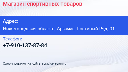 Магазин спортивных товаров по адресу Нижегородская область, Арзамас, Гостиный Ряд, 31 в дальнейшем Организация, размещена в следующих категориях: