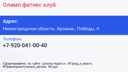 Олимп, фитнес-клуб по адресу Нижегородская область, Арзамас, Победы, 4 в дальнейшем Организация, размещена в следующих категориях: