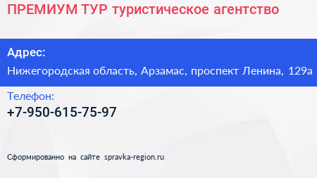 ПРЕМИУМ ТУР, туристическое агентство по адресу Нижегородская область, Арзамас, проспект Ленина, 129а в дальнейшем Организация, размещена в следующих категориях: