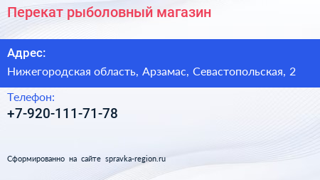 Перекат, рыболовный магазин по адресу Нижегородская область, Арзамас, Севастопольская, 2 в дальнейшем Организация, размещена в следующих категориях: