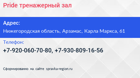 Pride, тренажерный зал по адресу Нижегородская область, Арзамас, Карла Маркса, 61 в дальнейшем Организация, размещена в следующих категориях: