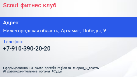 Scout, фитнес клуб по адресу Нижегородская область, Арзамас, Победы, 9 в дальнейшем Организация, размещена в следующих категориях:
