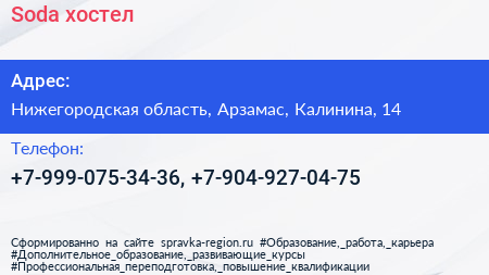 Soda, хостел по адресу Нижегородская область, Арзамас, Калинина, 14 в дальнейшем Организация, размещена в следующих категориях: