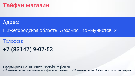 Тайфун, магазин по адресу Нижегородская область, Арзамас, Коммунистов, 2 в дальнейшем Организация, размещена в следующих категориях: