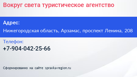 Вокруг света, туристическое агентство по адресу Нижегородская область, Арзамас, проспект Ленина, 208 в дальнейшем Организация, размещена в следующих категориях: