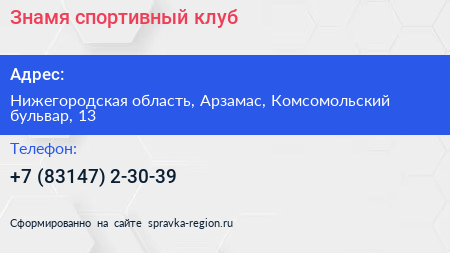 Знамя, спортивный клуб по адресу Нижегородская область, Арзамас, Комсомольский бульвар, 13 в дальнейшем Организация, размещена в следующих категориях: