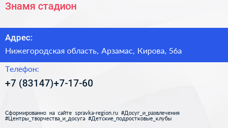 Знамя, стадион по адресу Нижегородская область, Арзамас, Кирова, 56а в дальнейшем Организация, размещена в следующих категориях: