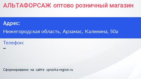 АЛЬТАФОРСАЖ, оптово-розничный магазин по адресу Нижегородская область, Арзамас, Калинина, 50а в дальнейшем Организация, размещена в следующих категориях: