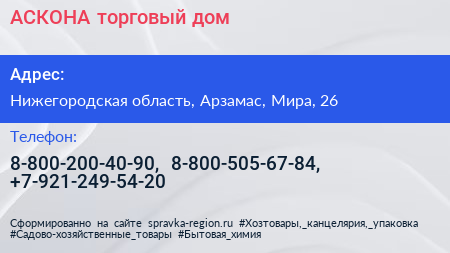 АСКОНА, торговый дом по адресу Нижегородская область, Арзамас, Мира, 26 в дальнейшем Организация, размещена в следующих категориях: