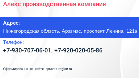 Алекс, производственная компания по адресу Нижегородская область, Арзамас, проспект Ленина, 121а в дальнейшем Организация, размещена в следующих категориях:
