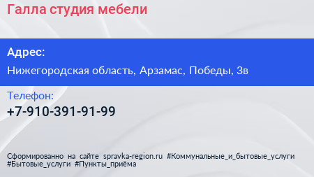Галла, студия мебели по адресу Нижегородская область, Арзамас, Победы, 3в в дальнейшем Организация, размещена в следующих категориях: