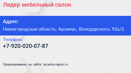 Лидер, мебельный салон по адресу Нижегородская область, Арзамас, Володарского, 92а/2 в дальнейшем Организация, размещена в следующих категориях: