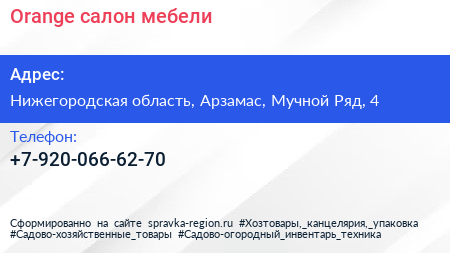 Orange, салон мебели по адресу Нижегородская область, Арзамас, Мучной Ряд, 4 в дальнейшем Организация, размещена в следующих категориях: