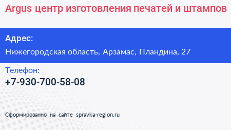 Argus, центр изготовления печатей и штампов по адресу Нижегородская область, Арзамас, Пландина, 27 в дальнейшем Организация, размещена в следующих категориях: