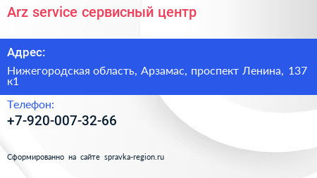 Arz-service, сервисный центр по адресу Нижегородская область, Арзамас, проспект Ленина, 137 к1 в дальнейшем Организация, размещена в следующих категориях: