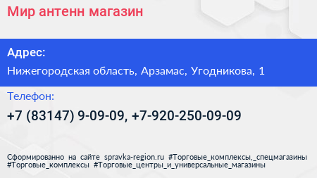 Мир антенн, магазин по адресу Нижегородская область, Арзамас, Угодникова, 1 в дальнейшем Организация, размещена в следующих категориях: