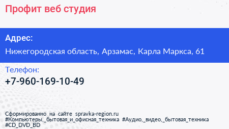 Профит, веб-студия по адресу Нижегородская область, Арзамас, Карла Маркса, 61 в дальнейшем Организация, размещена в следующих категориях: