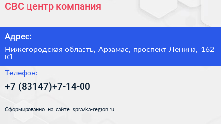 СВС-центр, компания по адресу Нижегородская область, Арзамас, проспект Ленина, 162 к1 в дальнейшем Организация, размещена в следующих категориях: