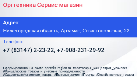 Оргтехника-Сервис, магазин по адресу Нижегородская область, Арзамас, Севастопольская, 22 в дальнейшем Организация, размещена в следующих категориях: