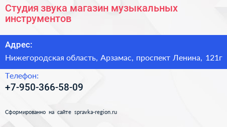 Студия звука, магазин музыкальных инструментов по адресу Нижегородская область, Арзамас, проспект Ленина, 121г в дальнейшем Организация, размещена в следующих категориях: