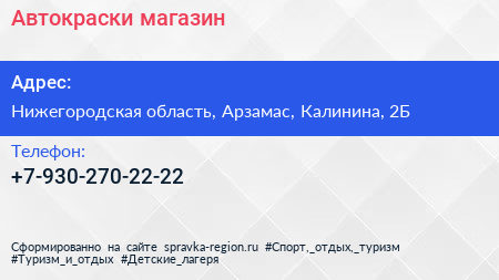Автокраски, магазин по адресу Нижегородская область, Арзамас, Калинина, 2Б в дальнейшем Организация, размещена в следующих категориях: