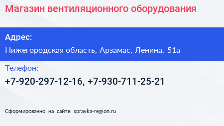 Магазин вентиляционного оборудования по адресу Нижегородская область, Арзамас, Ленина, 51а в дальнейшем Организация, размещена в следующих категориях: