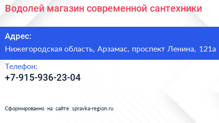 Водолей, магазин современной сантехники по адресу Нижегородская область, Арзамас, проспект Ленина, 121а в дальнейшем Организация, размещена в следующих категориях: