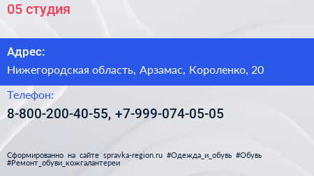 05, студия по адресу Нижегородская область, Арзамас, Короленко, 20 в дальнейшем Организация, размещена в следующих категориях: