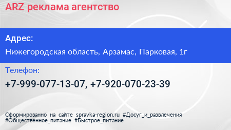 ARZ реклама, агентство по адресу Нижегородская область, Арзамас, Парковая, 1г в дальнейшем Организация, размещена в следующих категориях: