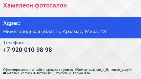 Хамелеон, фотосалон по адресу Нижегородская область, Арзамас, Мира, 13 в дальнейшем Организация, размещена в следующих категориях: