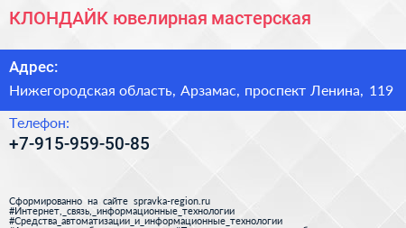КЛОНДАЙК, ювелирная мастерская по адресу Нижегородская область, Арзамас, проспект Ленина, 119 в дальнейшем Организация, размещена в следующих категориях: