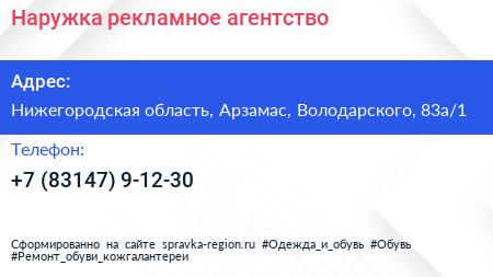 Наружка, рекламное агентство по адресу Нижегородская область, Арзамас, Володарского, 83а/1 в дальнейшем Организация, размещена в следующих категориях: