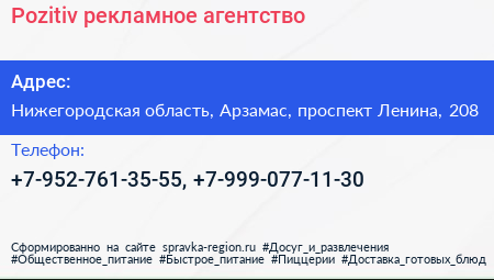 Pozitiv, рекламное агентство по адресу Нижегородская область, Арзамас, проспект Ленина, 208 в дальнейшем Организация, размещена в следующих категориях: