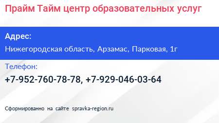 Прайм Тайм, центр образовательных услуг по адресу Нижегородская область, Арзамас, Парковая, 1г в дальнейшем Организация, размещена в следующих категориях: