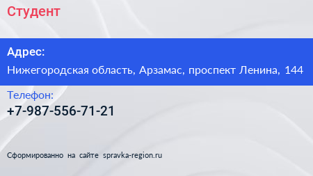 Студент+ по адресу Нижегородская область, Арзамас, проспект Ленина, 144 в дальнейшем Организация, размещена в следующих категориях:
