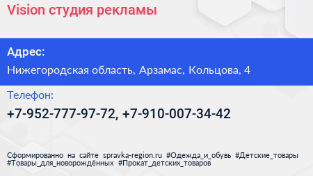 Vision, студия рекламы по адресу Нижегородская область, Арзамас, Кольцова, 4 в дальнейшем Организация, размещена в следующих категориях: