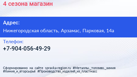 4 сезона, магазин по адресу Нижегородская область, Арзамас, Парковая, 14а в дальнейшем Организация, размещена в следующих категориях: