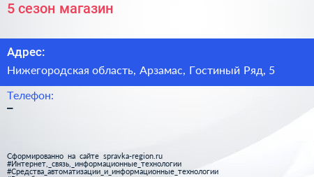 5 сезон, магазин по адресу Нижегородская область, Арзамас, Гостиный Ряд, 5 в дальнейшем Организация, размещена в следующих категориях: